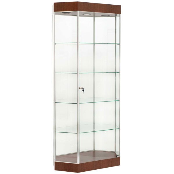 Base and top cornice are constructed of cherry HPL with chrome frame. Glass display area is 65" high.
