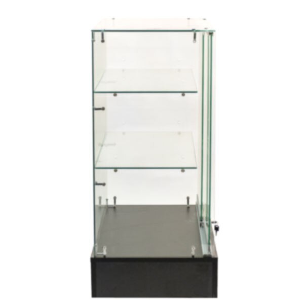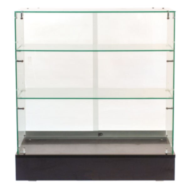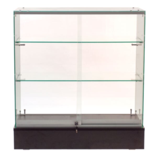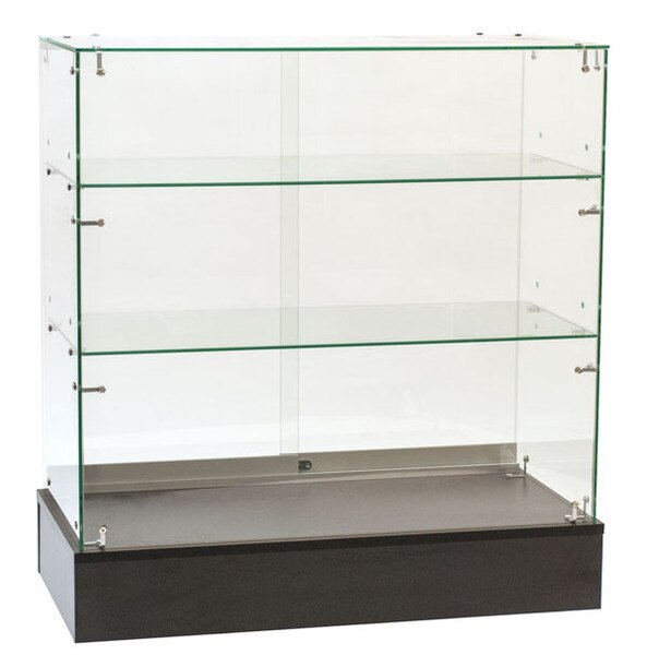 Case sits atop a 6" high black MDF wood base and features tempered glass on sides and top, sliding glass door with lock, and two 14" deep glass shelves.
